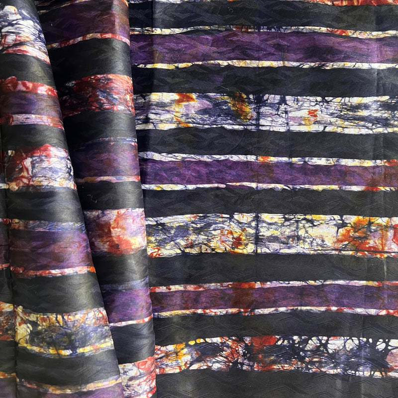 "Orun Glow," inspired by the Yoruba word "Orun," meaning "heaven" or "sun," is a stunning hand-crafted fabric that combines traditional batik and adire techniques. The design features bold black stripes interwoven with marbled hues of fiery red, radiant gold, and twilight purple.